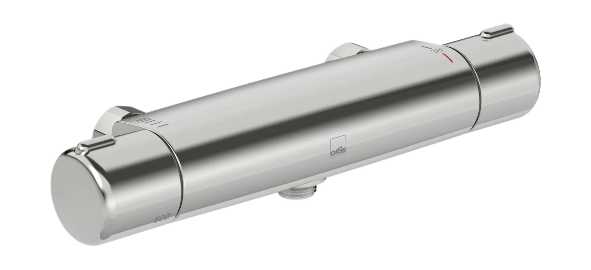 Termostat dusjkran. Temperatur rattet har sperreknapp for å hindre skålding. Med EcoFlow kontroll. Kranen har smussfilter og tilbakeslagsventiler.